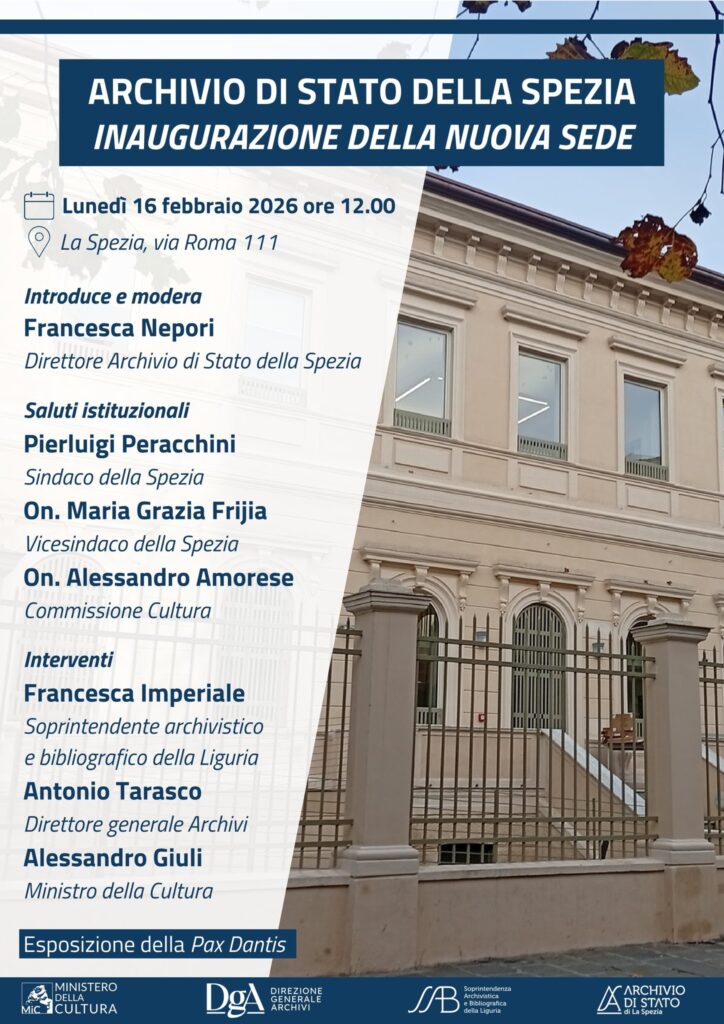 Lunedì 16 febbraio si è svolta la Cerimonia di inaugurazione della nuova sede dell’Archivio di Stato della Spezia, alla presenza del Ministro della Cultura Alessandro Giuli e con la partecipazione del Direttore Generale Archivi, Antonio Tarasco, il Sindaco della Spezia, Pierluigi Peracchini, il Vicesindaco On. Maria Grazia Frijia e On. Alessandro Amorese.