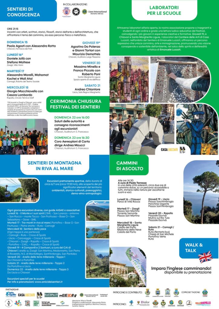 Il Festival propone escursioni e camminate inclusive tra Camogli, Zoagli, Chiavari, Rapallo e Portofino nonché incontri con atleti, scrittori, filosofi, storici dell’arte e dell’architettura, che affrontano il tema del cammino, sia esso percorso fisico o metafisico.
