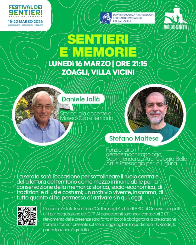 Si annuncia agli interessati Sentieri e memorie, una serata dedicata alla memoria del territorio prevista per lunedì 16 prossimo, presso Villa Vicini a Zoagli alle ore 21.15.